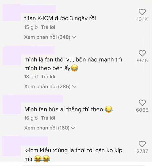 Sẽ không có gì đáng nói ở đây nếu như nhiều cư dân mạng để lại bình luận đặc biệt dưới bài đăng của K-ICM. Rất đông dân mạng bình luận nhằm ngỏ ý "quay xe" trở về làm fan của nam producer. Cụ thể, hàng loạt bình luận thừa nhận hiện tại đã làm fan của K-ICM, người 3 ngày, người 1 tuần, hay có người lại khẳng định là "fan thời vụ", "bên nào mạnh thì mình theo bên ấy".
