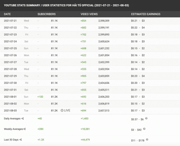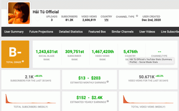 Theo thống kê của trang Social Blade, trong khoảng 1 tháng qua, kênh "Hải Tú Official" tăng trưởng lượt xem đạt 65,3% với 50.671 view, tăng trưởng lượt đăng ký đạt 40% với 2.100 người đăng ký. Doanh thu mỗi tháng của kênh này dao động từ 13 - 203 USD (tương đương 298 nghìn - 4,6 triệu đồng), mỗi năm từ 152 - 2400 USD (tương đương 3,5 triệu - 55 triệu đồng), tất cả đều chưa có dấu hiệu ngừng tăng.