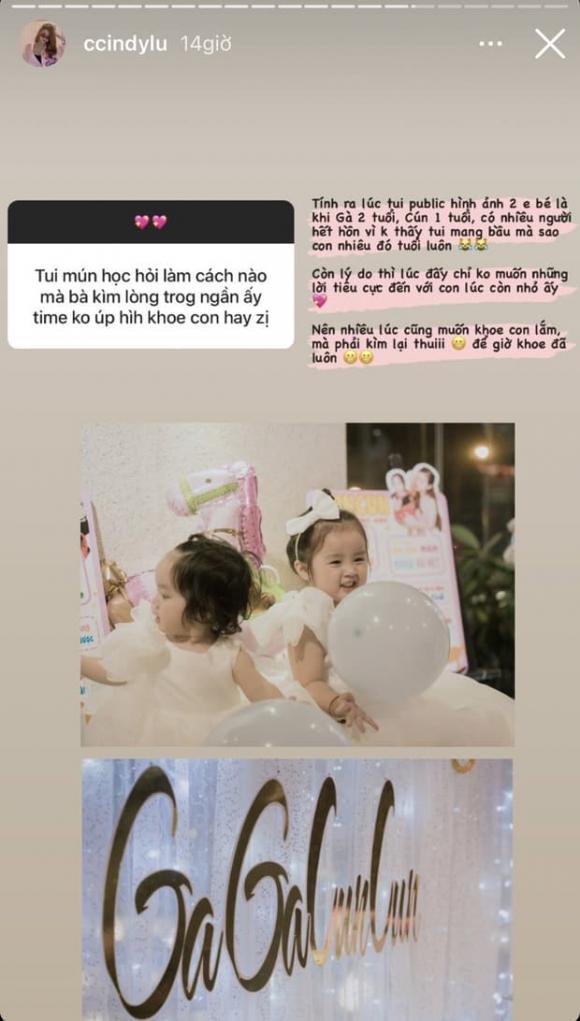Chia sẻ về việc này, Cindy Lư lần đầu tiết lộ lý do không cho 2 ái nữ lộ diện suốt thời gian dài: "Tính ra lúc tôi công khai 2 em bé là Gà đã 2 tuổi, Cún 1 tuổi, có nhiều người hết hồn vì không thấy tui mang bầu mà sao con nhiêu đó tuổi luôn. Còn lý do thì lúc đấy chỉ không muốn những lời tiêu cực đến với con lúc còn nhỏ. Nhiều lúc cũng muốn khoe lắm nhưng phải kìm lại thôi, để giờ khoe cho đã luôn".