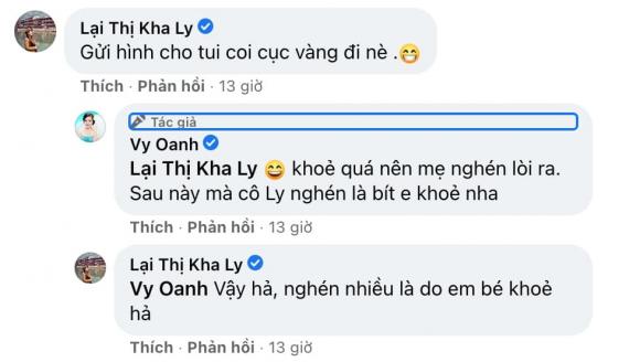 Danh hài Kiều Linh bày tỏ: "Nghe nói thôi đã mê". Còn diễn viên Kha Ly thì yêu cầu: "Gửi hình cho tui coi cục vàng đi nè". Diễn viên Hiền Hiền gửi một icon vô cùng đáng yêu và được bà mẹ Vy Oanh đáp lại: “Anh tui cũng có cục sữa để nựng suốt ngày rồi ha’. Đáp lại những người bạn của mình, Vy Oanh tiết lộ rằng, vì con khỏe quá nên cô bị nghén nặng trong thời gian mang thai.