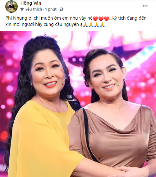 Theo đó, Hồng Vân đăng tải lên trang cá nhân hình ảnh cô và Phi Nhung vui cười rạng rỡ cùng chụp với nhau một bức ảnh. Ngoài ra nữ nghệ sĩ còn đính kèm dòng trạng thái: “Phi Nhung ơi chị muốn ôm em như vậy nè...kỳ tích đang đến xin mọi người hãy cùng cầu nguyện ạ”. Có thể thấy qua bức ảnh, tình cảm mà Hồng Vân dành cho phi nhung là vô cùng thân thiết.