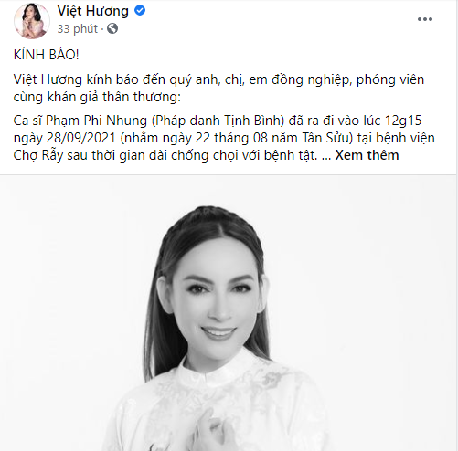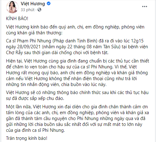 Hiện tại, Việt Hương cùng gia đình đang chuẩn bị các thủ tục cần thiết để chăm lo vẹn toàn cho hậu sự của ca sĩ Phi Nhung. Vì thế, Việt Hương rất mong quý báo, anh chị em đồng nghiệp và khán giả thông cảm nếu Việt Hương không thể nhận điện thoại cũng như trả lời những tin nhắn động viên, chia buồn vào lúc này.