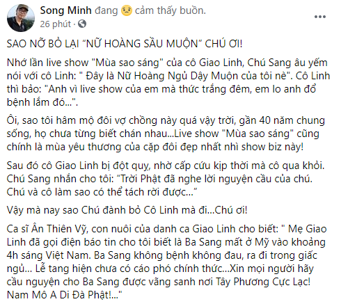 Mới đây nhà báo Song Minh bất ngờ chia sẻ lên trang cá nhân tin tang sự của gia đình danh ca Giao Linh.