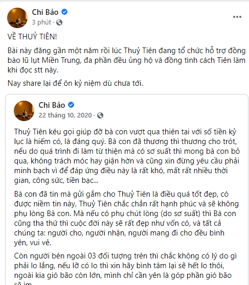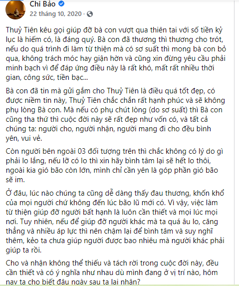 Cụ thể, trong bài viết cũ, Chi Bảo mong mọi người có thể hiểu và thông cảm cho Thủy Tiên trước hành động thiện nguyện mà nữ ca sĩ đã làm. Anh chia sẻ trong quá trình làm từ thiện nếu nữ ca sĩ có làm gì sơ suất cũng mong bà con có thể bỏ qua, không trách móc cô vì đáp ứng chuyện minh bạch là rất khó khăn và mất nhiều thời gian, công sức, tiền bạc,…