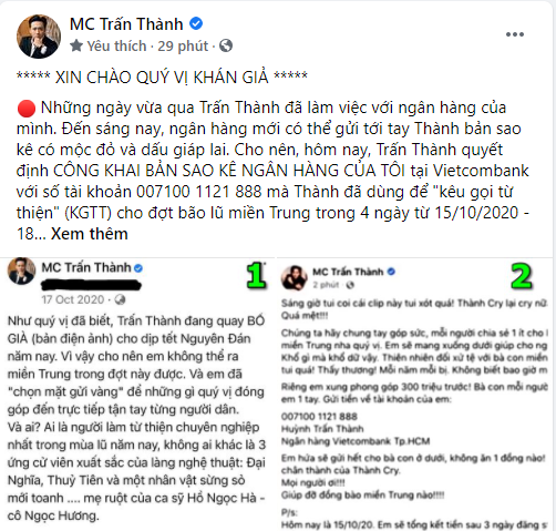 Mới đây, cả mạng xã hội xôn xao việc Trấn Thành tung một loạt sao kê và giải thích chi tiết vấn đề từ thiện của bản thân lên fanpage cá nhân. Nhiều cư dân mạng dành lời khen cho nam MC vì đã tung ra được bằng chứng chứng minh mình trong sạch.