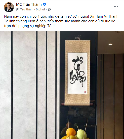 Là một người theo nghề diễn, Trấn Thành cũng không ngoại lệ khi chuẩn bị cho mình một mâm cúng tổ nghề trong nhà. Theo đó, mâm cúng tổ nghiệp của Trấn Thành vô cùng đơn giản, anh bày một mâm hoa quả cùng vài chiếc bánh trung thu. Bên trên tường được Trấn Thành treo chữ “Tổ Nghiệp”. Kèm theo đó là dòng trạng thái “Năm nay con chỉ có 1 góc nhỏ để tâm sự với người! Xin Tam Vị Thánh Tổ linh thiêng luôn ở bên, tiếp thêm sức mạnh cho con đủ trí lực để trọn đời phụng sự nghiệp Tổ!!”.
