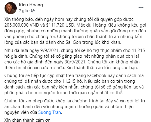 Mới đây, tỷ phú Hoàng Kiều bất ngờ đăng đàn, thông báo giữa đêm trên trang cá nhân. Cụ thể ông cho biết: “Như đã hứa ngày 9/9/2021, chúng tôi sẽ hỗ trợ thực phẩm cho 11,215 hộ gia đình. Chúng tôi sẽ cố gắng giao hết những phần quà còn lại cho các hộ gia đình đến ngày 30/9/2021. Chúng tôi xin không nhận thêm tin nhắn xin cứu trợ nữa. Xin thành thật cáo lỗi cùng các bạn.”.