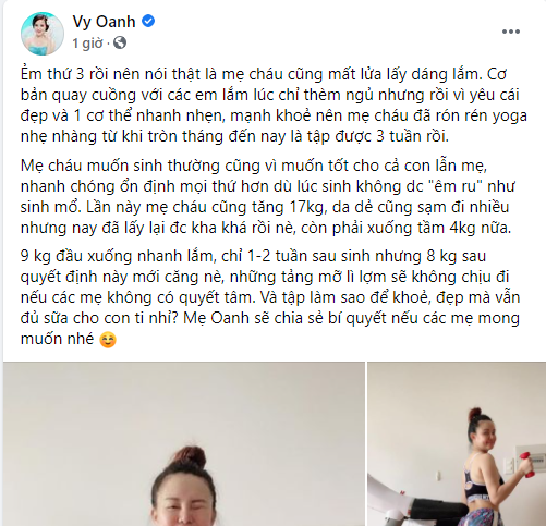 Là mẹ của 3 người con, trải qua nhiều lần sinh nở khiến vóc dáng của Vy Oanh bị ảnh hưởng khá nhiều. Mới đây, nữ ca sĩ đã đăng tải loạt ảnh tập luyện tại nhà sau 7 tuần sinh khiến người hâm mộ bất ngờ khi chia sẻ bản thân đã giảm được 9kg chỉ trong 1-2 tuần kể từ khi lâm bồn.