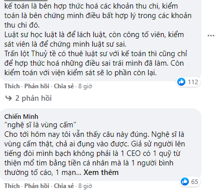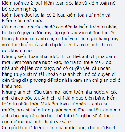 Trước những lời mỉa mai đó, Thuỷ Tiên cho biết không thể mời kiểm toán vì các công ty kiểm toán chỉ nhận làm cho doanh nghiệp, không nhận cá nhân. Cụ thể chia sẻ của vợ chồng Thuỷ Tiên - Công Vinh: “Kiểm toán nhà nước thì đã có ngân hàng rồi. Chúng tôi đã thuê các công ty kiểm toán, thậm chí là công ty nước ngoài nhưng họ chỉ nhận kiểm toán doanh nghiệp, không nhận kiểm toán cá nhân. Chúng tôi gọi rồi chứ không phải không gọi. Không có luật nào cho kiểm toán cho cá nhân cả”.