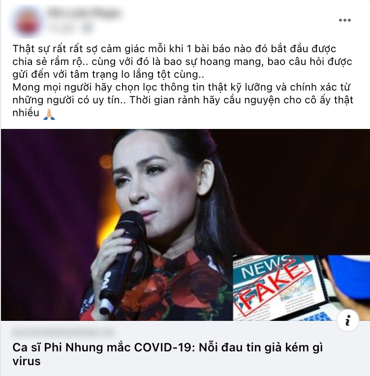 Trước những tin đồn thất thiệt về Phi Nhung, quản lý của cô từng lên tiếng: "Thay mặt Phi Nhung xin cảm ơn sự quan tâm của khán giả, báo chí những ngày qua. Phi Nhung đang được điều trị Covid-19 tại Bệnh viện Chợ Rẫy”.