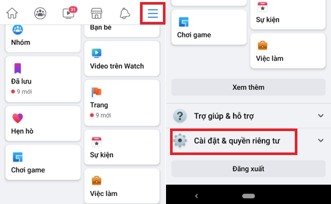 Bước 1: Mở ứng dụng Facebook, sau đó chọn dấu 3 gạch phía bên phải màn hình rồi chọn “Cài đặt và Quyền riêng tư”