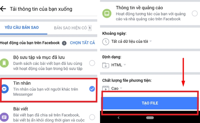 Bước 3: Khi đã vào phần tải thông tin, có khá nhiều mục bạn có thể tải xuống nhưng chỉ cần chọn Tin nhắn thôi nhé. Bây giờ thì kéo xuống và nhấn vào tạo file