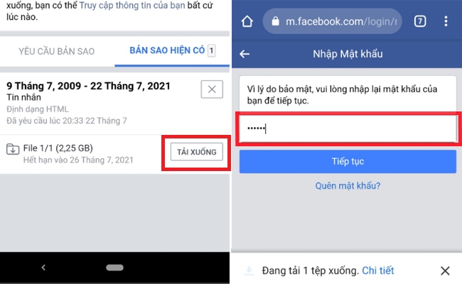 Bước 4: Sau khi yêu cầu tạo file, bạn chờ một chút để hệ thống tạo bản sao tin nhắn. Tiếp theo bạn nhấn “Tải xuống” để tải tin nhắn Facebook messenger.