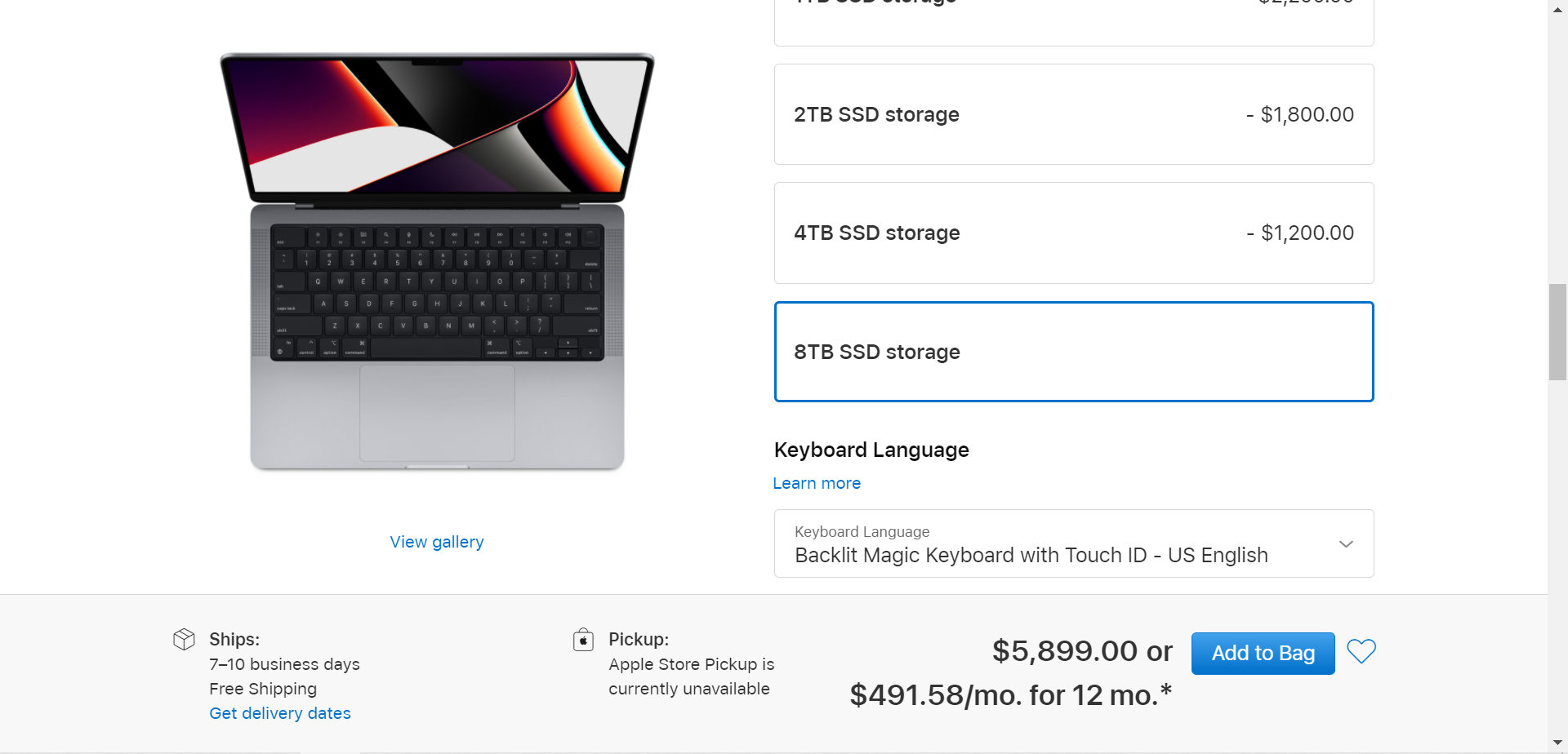 Giá của phiên bản tiêu chuẩn cho dòng Pro 16 inch là 2499 USD, tuy nhiên nếu bạn chọn phiên bản cấu hình cao nhất của nó với 64GB RAM, chip M1 Max bản cao nhất và 8TB SSD bộ nhớ trong. Mức giá mà bạn phải trả sẽ là 6099 USD ( khoảng 140 triệu), tương tự với dòng 14 inch, cấu hình cao nhất sẽ có giá là 5899 USD( tương đương 134 triệu) cũng không hề kém cạnh.