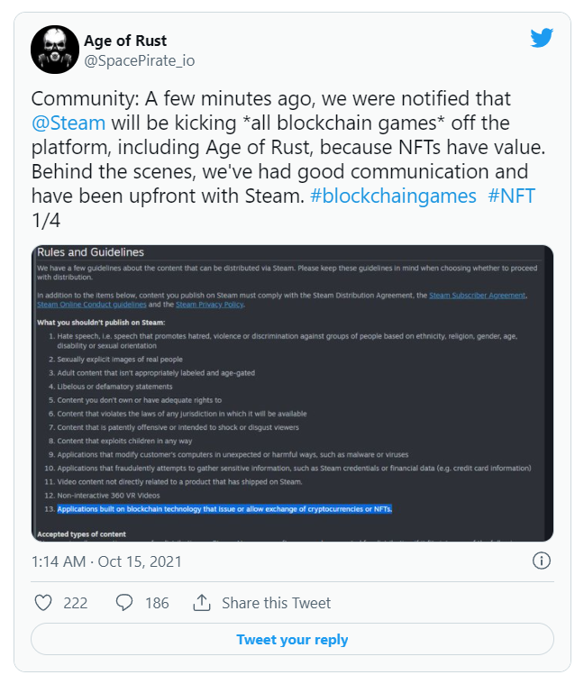 Một số nhà phát triển đã lên tiếng về quy tắc này. SpacePirate Games, studio đứng sau tựa game phiêu lưu hành động khoa học viễn tưởng Age of Rust, đã cho rằng các trò chơi blockchain bị xóa khỏi Steam vì NFT đang có giá trị. "Quan điểm của Steam là đối với các mặt hàng có giá trị trong thế giới thực, họ không cho phép chúng tồn tại trên nền tảng của họ", SpacePirate nói.