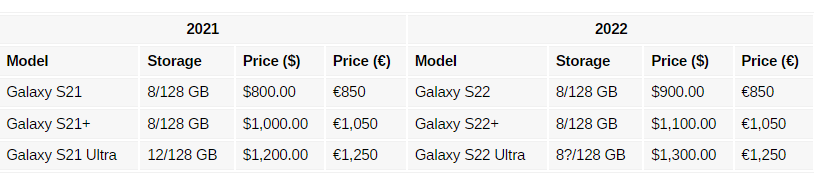 Chúng tôi đã tổng hợp một bảng dưới đây để so sánh thế hệ Galaxy S21 với các mẫu S22 sắp ra mắt. Lưu ý rằng Galaxy S22 Ultra có thể sẽ bắt đầu với 8 GB RAM thay vì 12 GB như năm ngoái, mặc dù điều đó có thể không đúng với phiên bản tại Mỹ, do giá cao hơn. S22 và S22 + nên giữ nguyên cấu hình bộ nhớ của chúng.