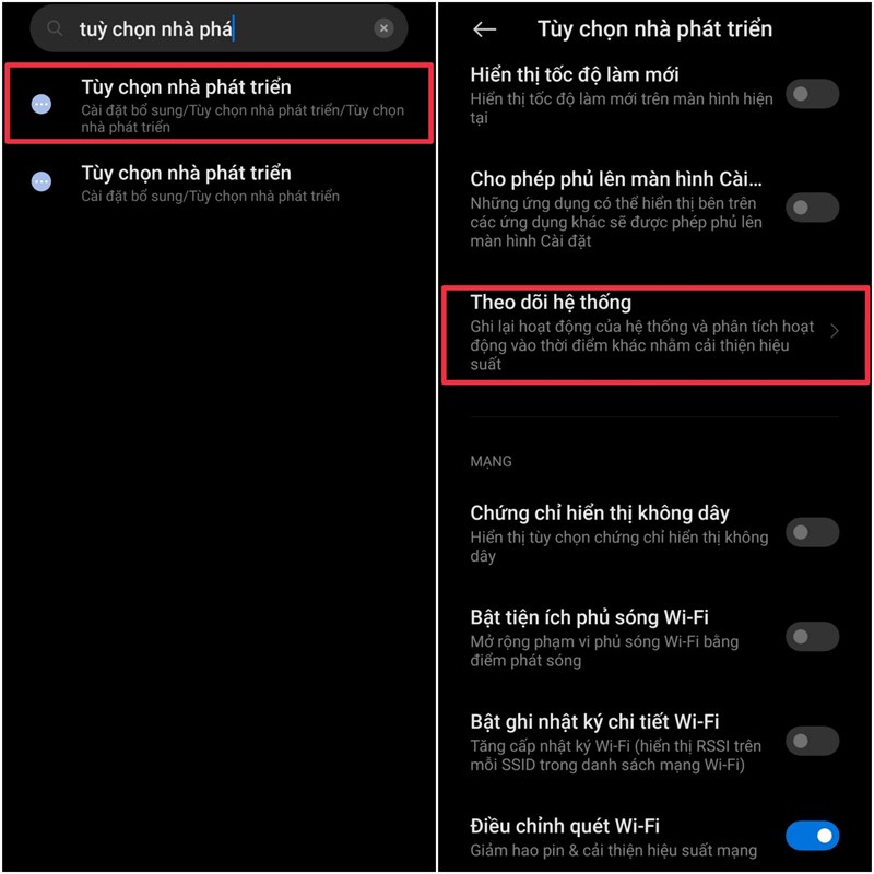 Tiếp theo, nhập vào khung tìm kiếm Tùy chọn nhà phát triển và chọn tính năng này, kéo xuống dưới để tìm phần Theo dõi hệ thống.