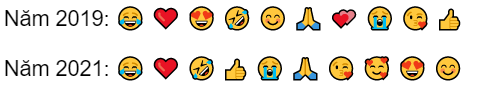 Điều thú vị là biểu tượng cảm xúc phổ biến số một năm 2021 cũng giống như năm 2019 là những giọt nước mắt vui mừng. Theo dữ liệu, biểu tượng cảm xúc này hầu như không thay đổi thứ hạng trong hai năm qua.