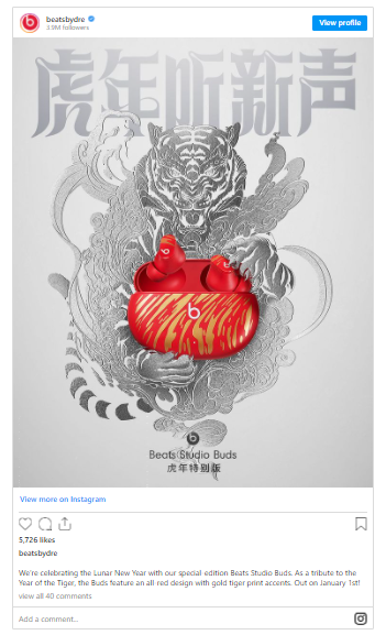 Chiếc tai nghe này đã có sẵn màu đỏ, nhưng phiên bản Tết Nguyên đán đặc biệt đi kèm với các sọc vàng tượng trưng cho các điểm nhấn in hình con hổ, vì năm 2022 sẽ là năm con hổ. Theo công ty, sản phẩm sẽ có mặt trên các cửa hàng bắt đầu từ ngày 1 tháng 1 năm 2021. Beats Studio Buds có thiết kế in-ear giống như AirPods Pro của Apple. Nó được trang bị Chống ồn chủ động, thời lượng pin 8 giờ và Bluetooth mới nhất để ghép nối nhanh với các thiết bị iOS và Android.