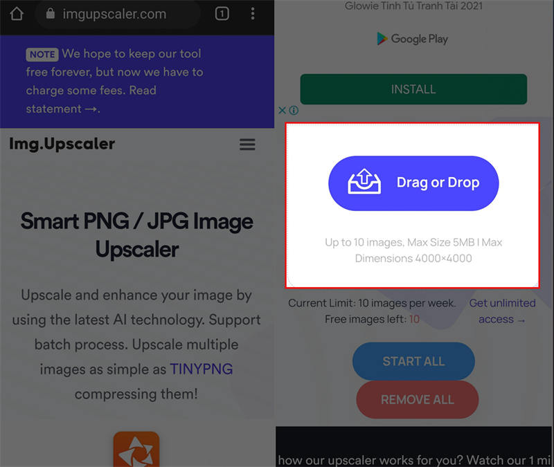 Đầu tiên, hãy vào trang web https://imgupscaler.com/ và nhấn vào Drag and Drop để tải ảnh lên.