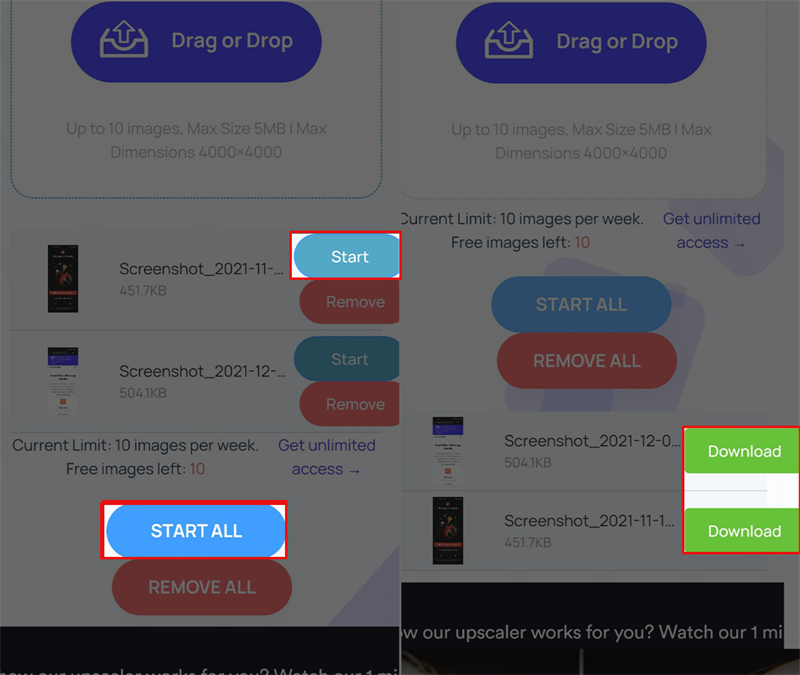 Tiếp theo, nếu chi có một tấm ảnh, hãy nhấn Start nếu bạn muốn phóng to hoặc nhấn Start All để phóng to nhiều tấm ảnh cùng lúc. Sau khi xử lý xong, nhấn Download để tải bức ảnh vừa phóng to về điện thoại.