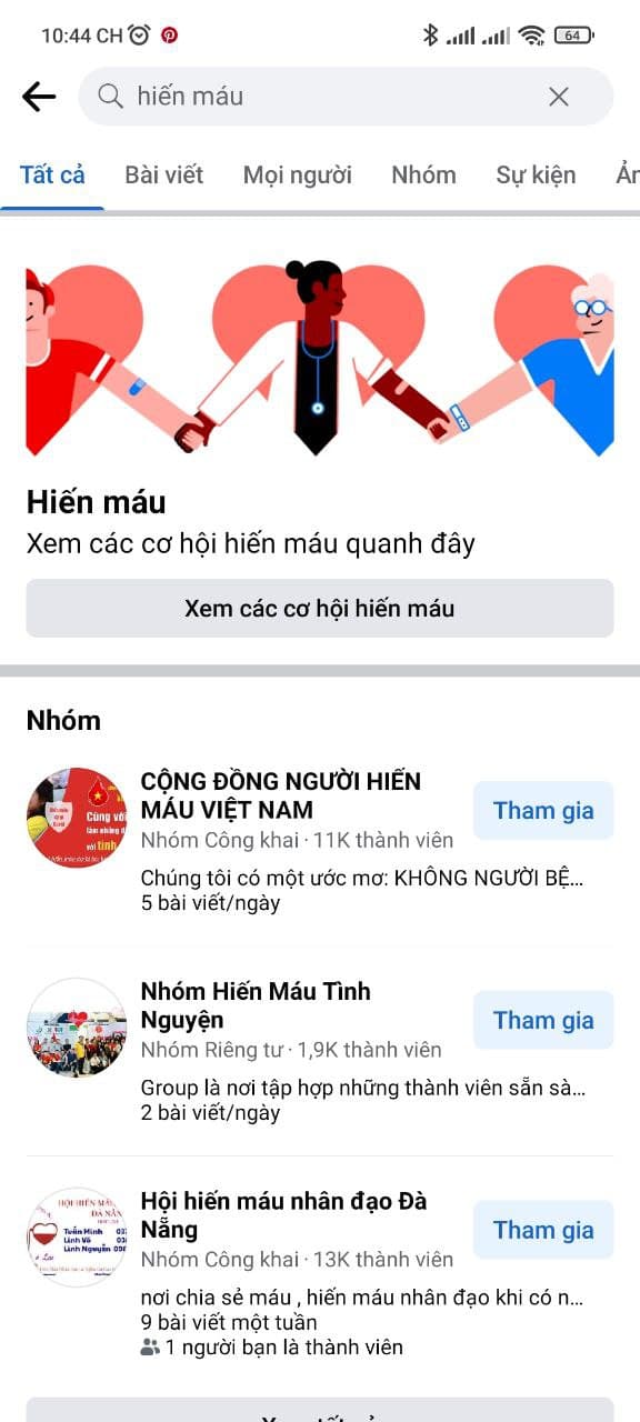 Đầu tiên bạn vào Facebook, và nhập trên thanh tìm kiếm từ khóa “ hiến máu”. Kết quả hiện ra và bạn hãy nhấn vào phần Xem các cơ hội hiến máu
