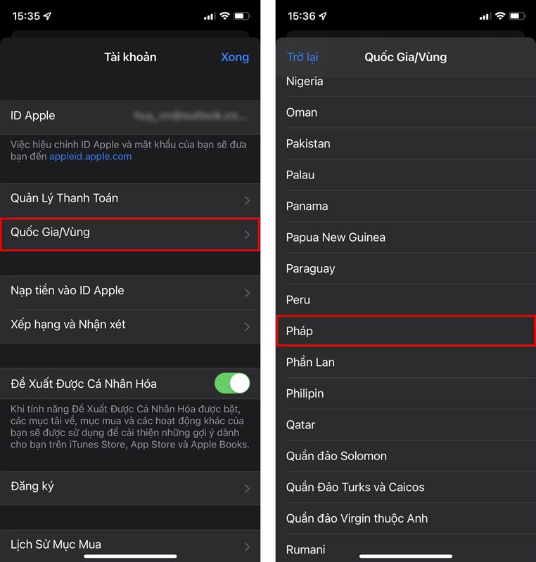 Bước 2: Tiến hành chọn Quốc Gia/Vùng > Lựa chọn tên quốc gia mà bạn muốn đổi.