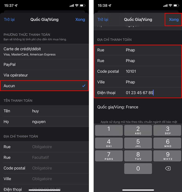Bước 3. Mục Phương thức thanh toán, bạn chọn Không (Aucun). Địa chỉ thanh toán, bạn điền thông tin như hình nếu chọn Pháp. Sau đó nhấn Xong.