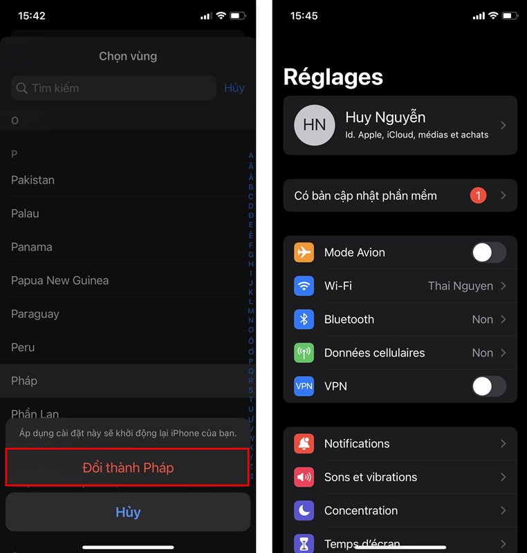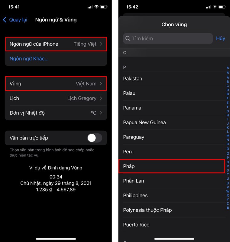 Bước 5: Ở đây, bạn lần lượt đổi Ngôn ngữ của iPhone và Vùng sang quốc gia mà bạn đã thay đổi trên App Store