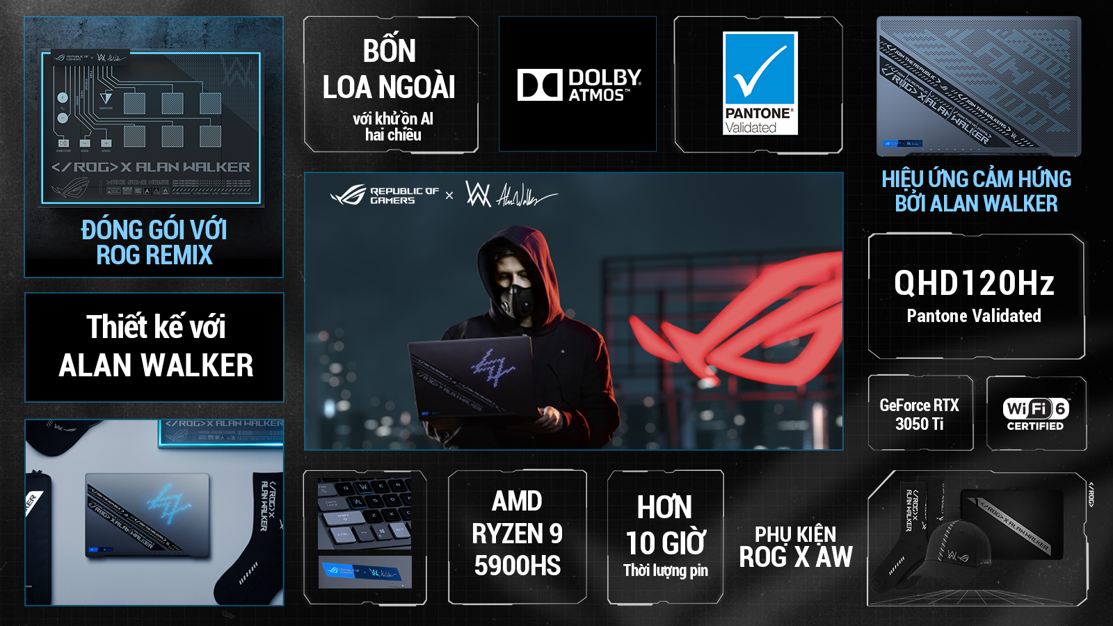 Khi ROG lần đầu hợp tác với Alan Walker, một mẫu laptop nổi bật trong lĩnh vưc âm nhạc đã được tạo ra như là một người đồng hành hoàn hảo cho game thủ và những nhà sáng tạo nội dung. Phiên bản đặc biệt ROG Zephyrus G14 Alan Walker kết hợp tính cơ động và hiệu suất mạnh mẽ từ CPU đầu bảng AMD Ryzen 9 5900HS và đồ họa NVIDIA GeForce RTX 3050Ti. Đối với cộng đồng Walker, đây là công cụ tối ưu cho các game thủ và nhà sáng tạo, luôn sẵn sàng cho mọi tác vụ chỉ trong vòng một nốt nhạc.
