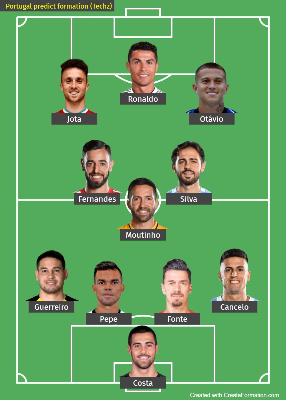 Bồ Đào Nha: Costa; Cancelo, Pepe, Fonte, Guerreiro; Moutinho, Bernado Silva, Bruno Fernandes; Ronaldo, Otavio, Diogo Jota.