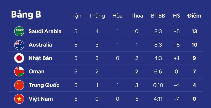 Trải qua 5 lượt trận, ĐT Việt Nam xếp cuối bảng B với thành tích toàn thua, ghi được 4 bàn và để thủng lưới 11 bàn. Trong khi đó, đối thủ sắp tới của thầy trò HLV Park Hang-seo là Saudi Arabia đang thể hiện phong độ rất cao với 4 trận thắng và 1 trận hòa, giành được 13 điểm và đứng đầu bảng B.