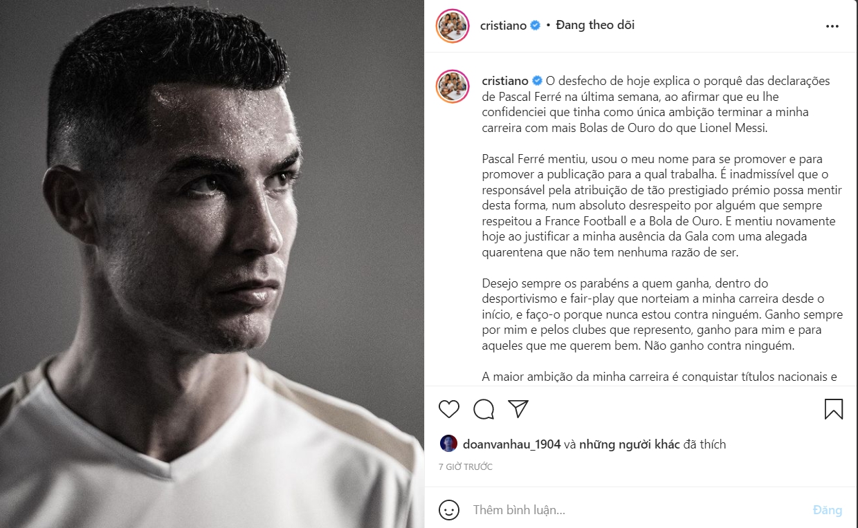 "Kết quả ngày hôm nay giải thích lí do vì sao lại có đoạn chia sẻ của Pascal Ferre nói rằng tham vọng của tôi là đạt nhiều bóng vàng hơn Messi. Ferre đã bịa đặt, ông ta đã sử dụng tên tuổi của tôi để đánh bóng tên tuổi ông ta, quảng cáo cho tạp chí của ông ta.