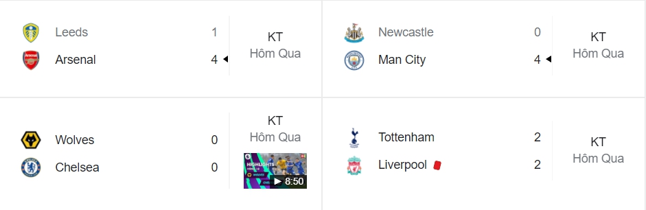 Arsenal đã tiếp tục chuỗi phong độ thăng hoa của mình khi đánh bại Leeds United với tỷ số 4-1, qua đó giữ vững vị trí trong top 4 của mình. Trong khi đó, 2 đội bóng xếp trên họ là Chelsea và Liverpool lại không thể giành trọn vẹn 3 điểm. Đoàn quân của Thomas Tuchel và Jurgen Klopp đều có những trận hòa trước Wolves và Tottenham. Đây là tin không thể vui hơn cho Man City bởi thầy trò Pep Guardiola đã không gặp bất kỳ khó khăn nào để hạ gục Newcastle với 4 bàn không gỡ.