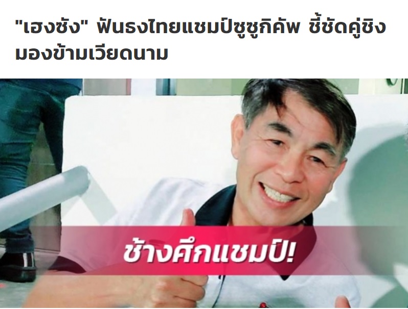 "Nếu được hỏi đối thủ thật sự của ĐT Thái Lan là ai, tôi sẽ chọn Malaysia. Singapore mặc dù là chủ nhà nhưng không có tiềm năng. Trong khi ĐT Việt Nam đã xuống tinh thần sau màn trình diễn tệ hại ở vòng loại World Cup mà không có được chiến thắng nào.
