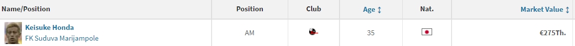 Giá trị chuyển nhượng hiện tại của Keisuke Honda theo Transfermarkt.