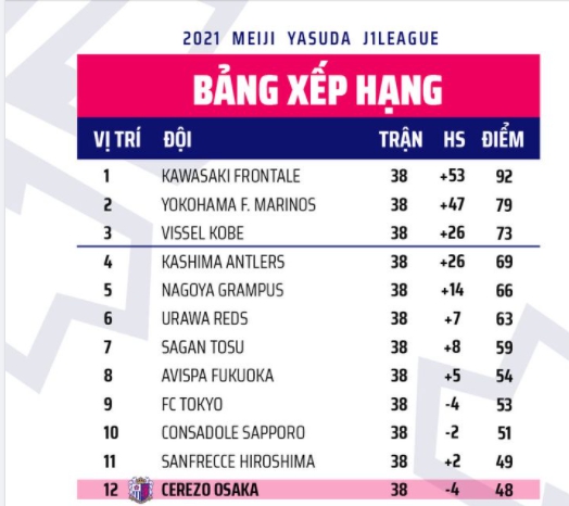 Cerezo Osaka kết thúc J.League 2021 ở vị trí thứ 12. Đây là kết quả rất đáng thất vọng với đội bóng này.