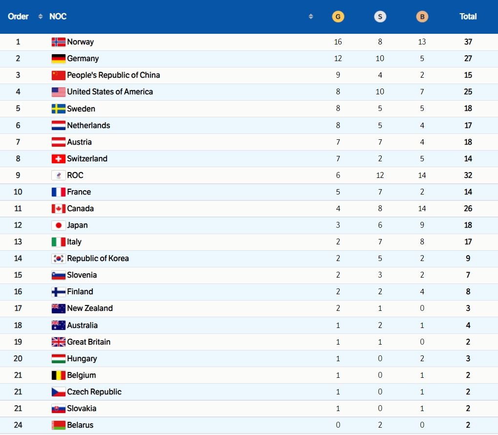 Bảng tổng sắp huy chương Olympic mùa Đông 2022 (liên tục cập nhật...)