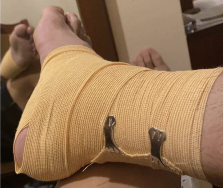 Cầu thủ sinh năm 1999 phải băng bó chân sau trận đấu với Thái Lan.