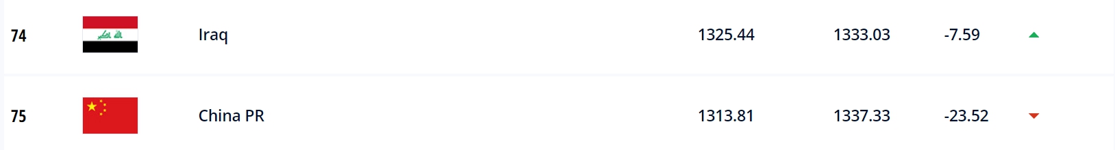 ĐT Trung Quốc bị trừ 23,52 điểm sau 2 trận thua và tụt xuống hạng 75 Thế giới.