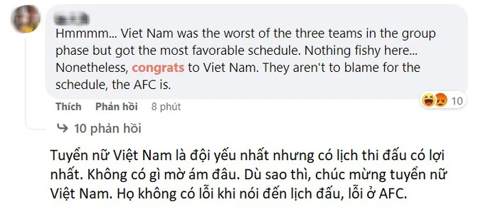 Một bình luận có viết: "Việt Nam là đội yếu nhất trong ba đội tham dự vòng play-off nhưng họ lại được AFC ưu ái về lịch thi đấu. Không có gì bất ngờ ở đây. Dù sao cũng chúc mừng ĐT Việt Nam. Họ không có lỗi về lịch thi đấu mà là AFC."