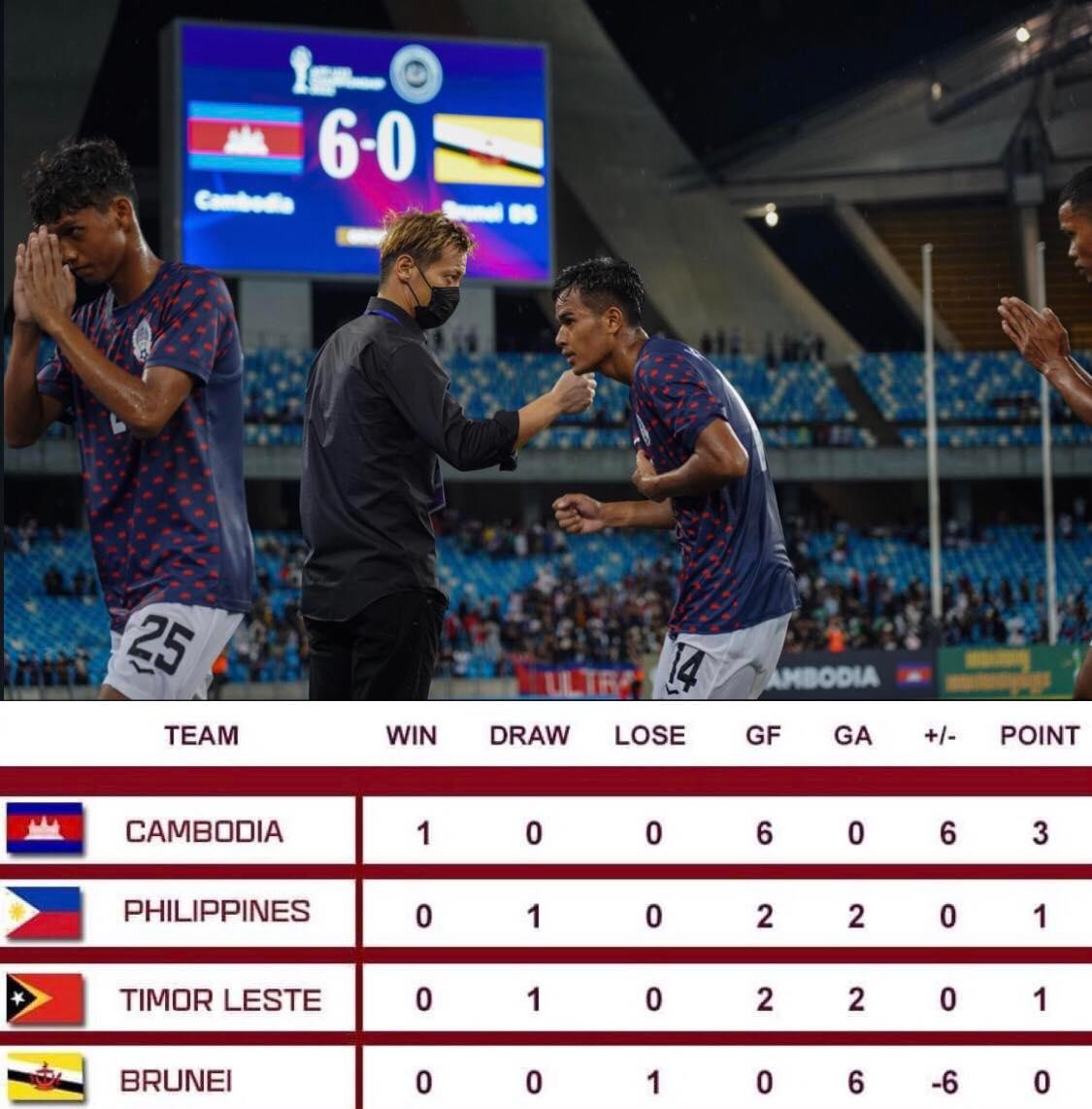 Trong trận ra quân, thầy trò HLV Keisuke Honda chỉ phải gặp một đối thủ yếu U23 Brunei. Không quá bất ngờ khi U23 Campuchia giành chiến thắng đậm với tỷ số 6-0 qua đó vươn lên dẫn đầu bảng A với 3 điểm tuyệt đối. Thắng lợi này sẽ giúp cho tinh thần của đội chủ nhà thoải mái hơn trước khi chạm trán với Philippines (ngày 17/2 tới).