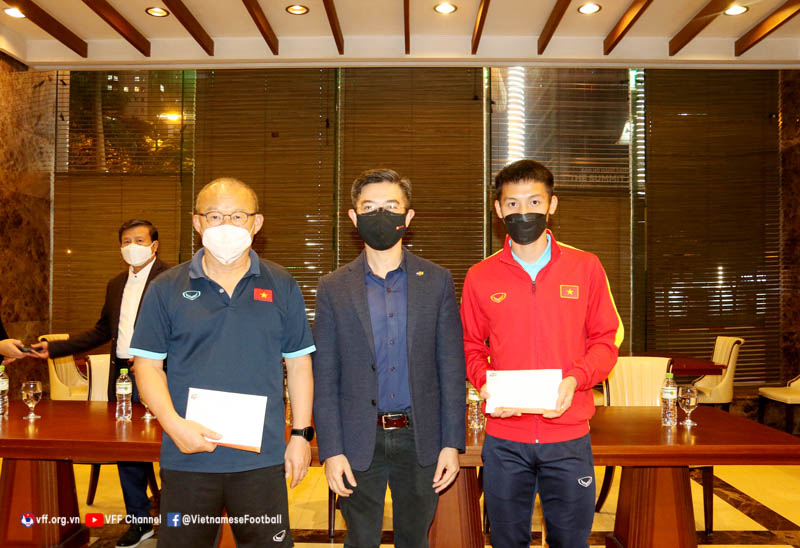 HLV Park và đội trưởng Đỗ Hùng Dũng thay mặt ĐT Việt Nam nhận quà từ các đơn vị cũng như quà chúc mừng của Chủ tịch nước Nguyễn Xuân Phúc.