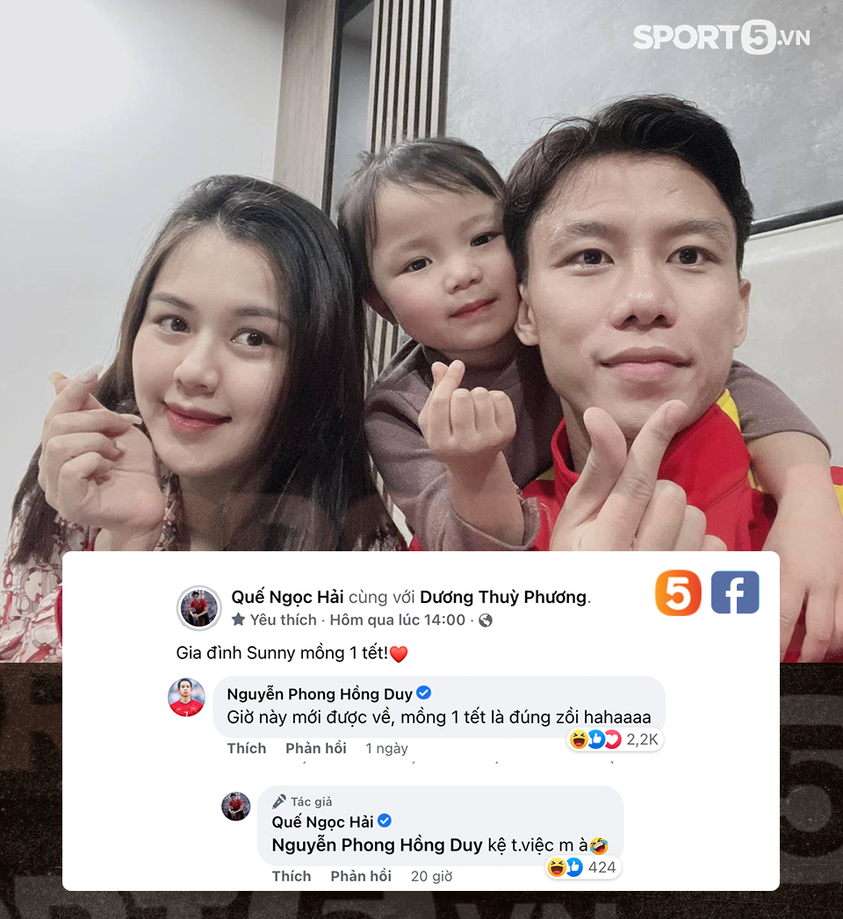 Quế Ngọc Hải là ngôi sao của ĐT Việt Nam về quê ăn Tết muộn nhất do phải ở lại Hà Nội cách ly. Tối mùng 4 Tết, trung vệ quê Nghệ An mới đoàn tụ cùng gia đình để đón năm mới. Trên trang cá nhân, Quế Ngọc Hải đã đăng tải bức ảnh cùng vợ và con gái nhưng đã bị đàn em Hồng Duy trêu chọc. Cựu đội trưởng của ĐT Việt Nam cũng phản ứng lại cực gắt.