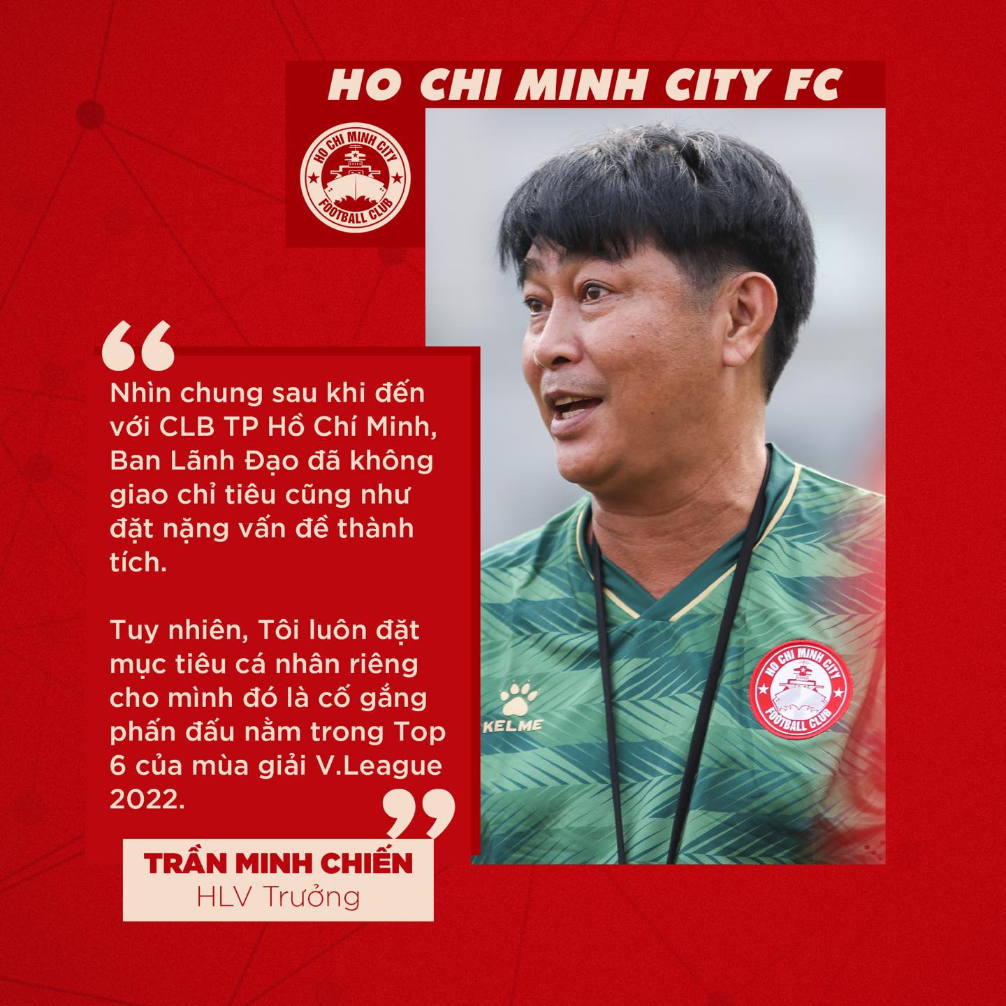 Trước thềm mùa giải 2022, CLB TP.HCM không còn đầu tư ồ ạt như những mùa giải trước đó. HLV Trần Minh Chiến ưu tiên trao cơ hội cho những cầu thủ trẻ. Chính vì vậy, Ban lãnh đạo của đội chủ sân Thống Nhất cũng không đặt nặng vấn đề thành tích ở V.League 2022. Mặc dù vậy, HLV Trần Minh Chiến vẫn ra mục tiêu cho các học trò:
