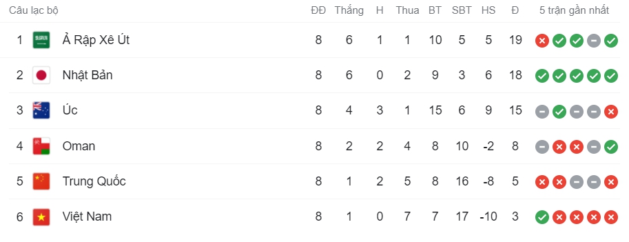 Bảng xếp hạng bảng B sau 8 lượt trận.