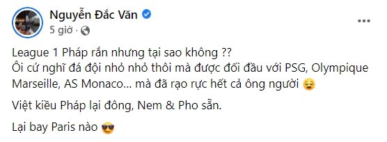 Trên trang cá nhân của mình, ông Đắc Văn chia sẻ: "Ligue 1 Pháp rắn nhưng tại sao không?? Ôi cứ nghĩ đá đội nhỏ nhỏ thôi mà được đối đầu với PSG, Olympique Marseille, AS Monaco… mà đã rạo rực hết cả ông người. Việt kiều Pháp lại đông, Nem và Phở sẵn. Lại bay Paris nào."