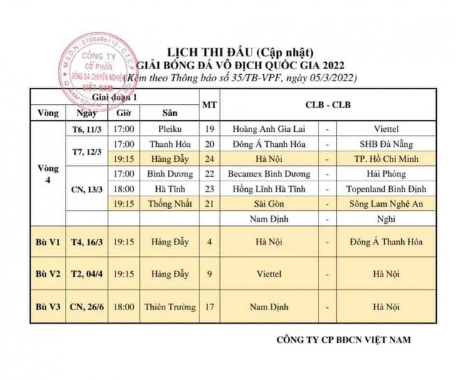 Lịch thi đấu bù 3 vòng đấu đầu tiên của CLB Hà Nội.