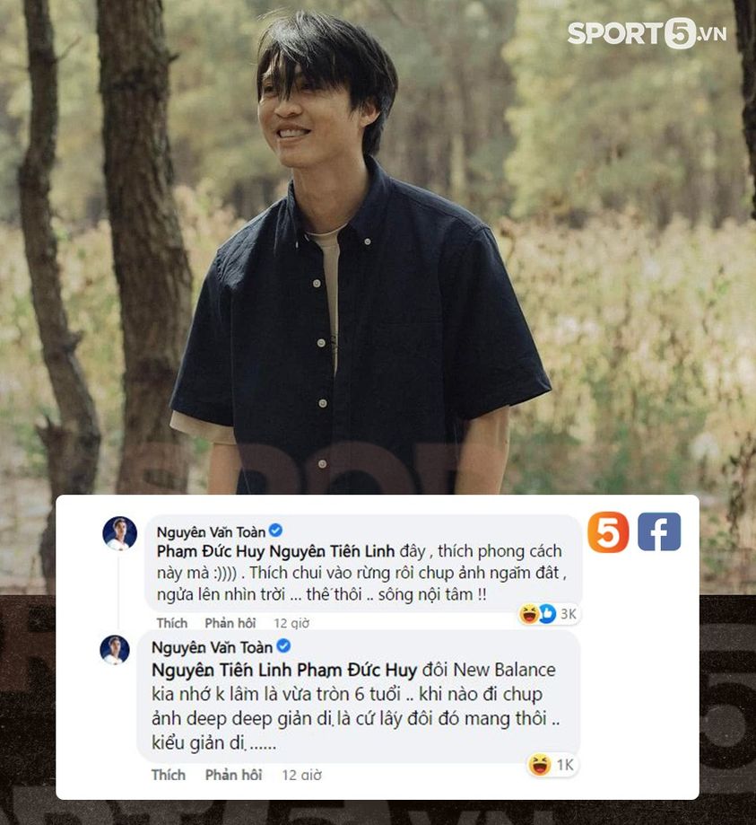 Chưa dừng lại ở đó, Văn Toàn còn để ý đến đôi giày của Tuấn Anh: "Đôi New Balance kia nhớ không lầm là vừa tròn 6 tuổi... Khi nào đi chụp ảnh deep deep giản dị là cứ lấy đôi đó mang thôi... Kiểu giản dị"... Chung vui với Văn Toàn, Đức Huy cũng trêu đùa đòi xử đẹp Tuấn Anh: "Mang khẩu súng ra đây. Tao bắn nó". Còn Tiến Linh chỉ để lại một chữ "cay".