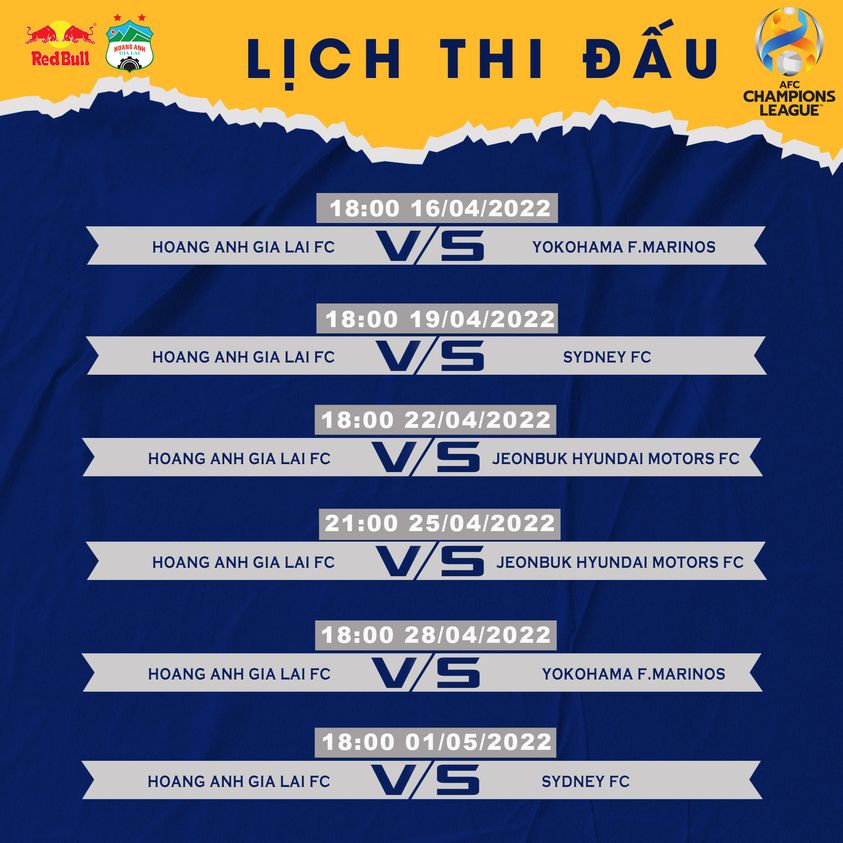 CLB HAGL mới đây đã chính thức đăng tải lịch thi đấu chính thức của bảng H AFC Champions League sắp tới. Các trận đấu của đội bóng phố Núi sẽ chính thức bắt đầu từ ngày 16/4 và kéo dài đến ngày 1/5. HAGL sẽ phải chạm trán với những đội bóng rất mạnh ở bảng H là Jeonbuk Hyundai Motors, Yokohama F.Marinos và Sydney FC.